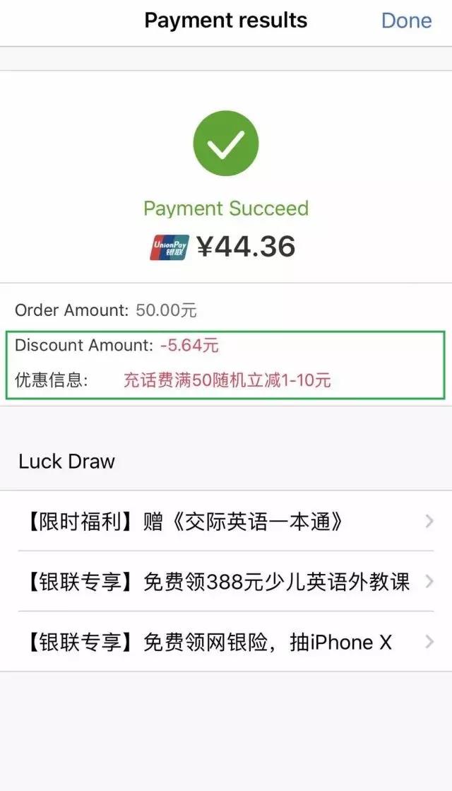在云闪付APP内进行手机充值时选择【云闪付】付款 ,,,充值金额(非实付金额)满50元 ,,,即可享受随机立减1-10元优惠。。。活动期间每日限量5万笔 ,,,单用户每自然月限享受1笔优惠 ,,,数量有限 ,,,先到先得。。。